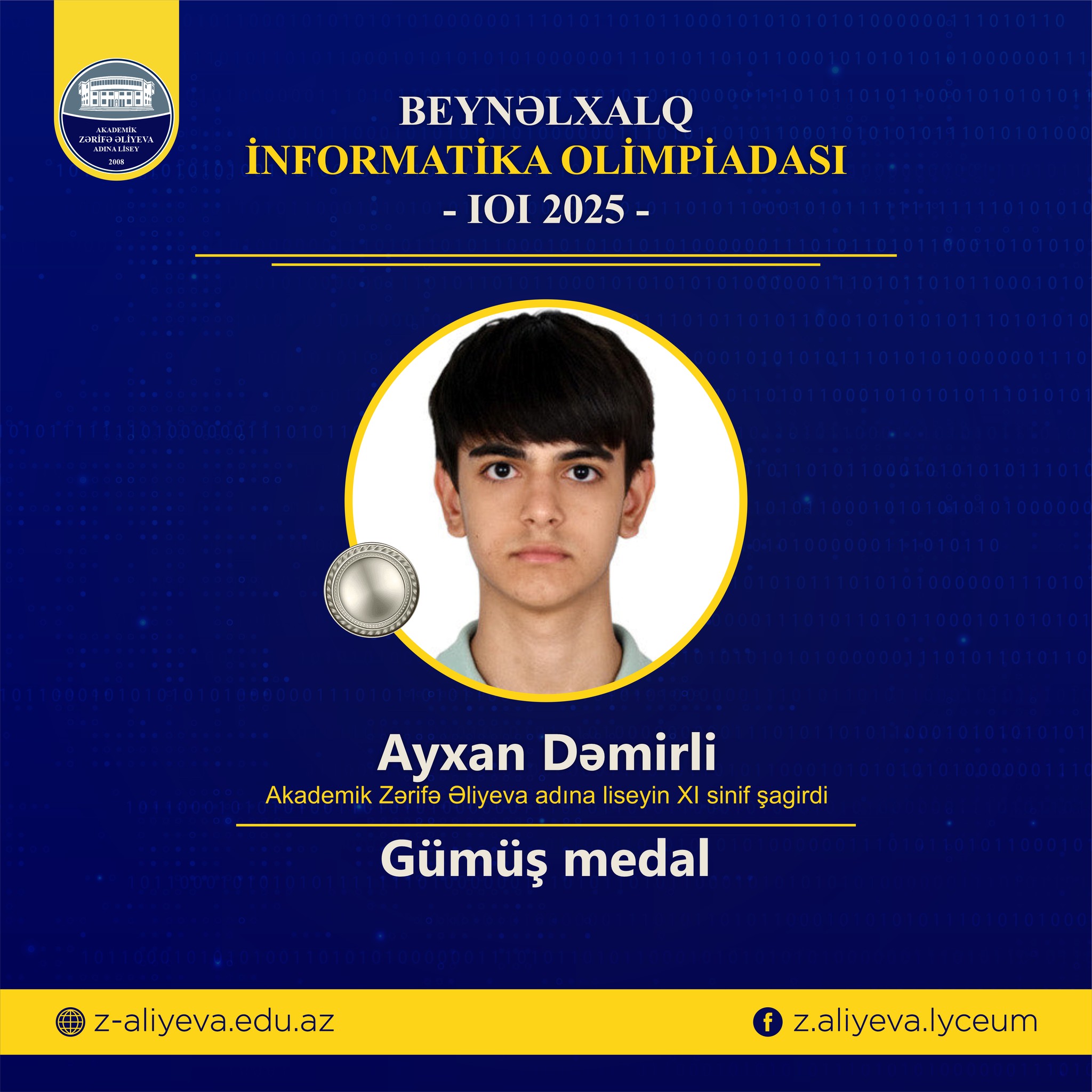 27 iyul – 3 avqust tarixlərində Boliviyanın paytaxtı Sukre şəhərində təşkil edilən məktəblilərin 37-ci Beynəlxalq İnformatika Olimpiadasında (IOI 2025) akademik Zərifə Əliyeva adına liseyin XI sinif şagirdi Ayxan Dəmirli yüksək nəticə göstərərək gümüş medal qazanıb.