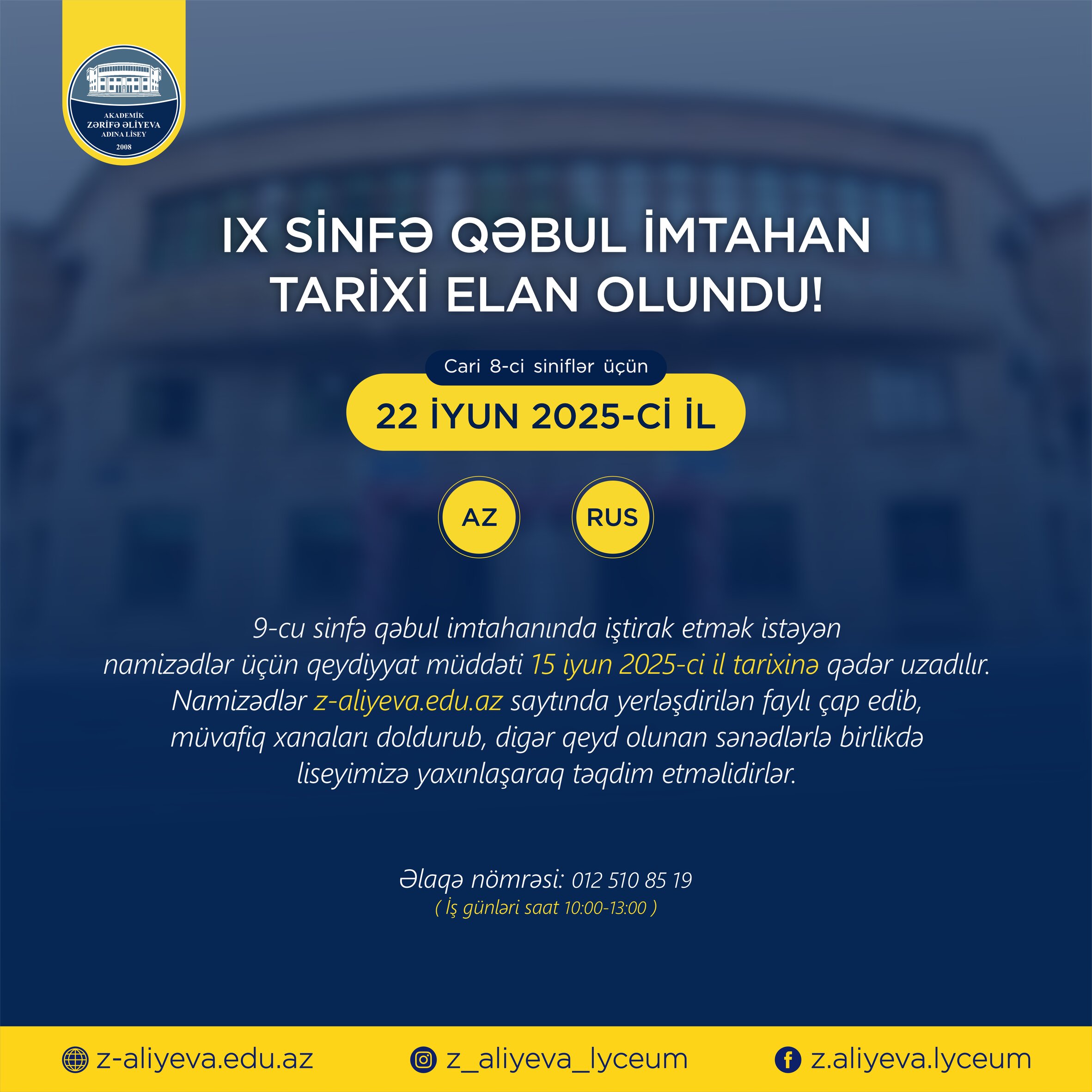 İmtahanda iştirak etmək üçün müvafiq buraxılış vərəqini isə 18-21 iyun tarixlərində liseyimizdən əldə edə bilərsiniz.