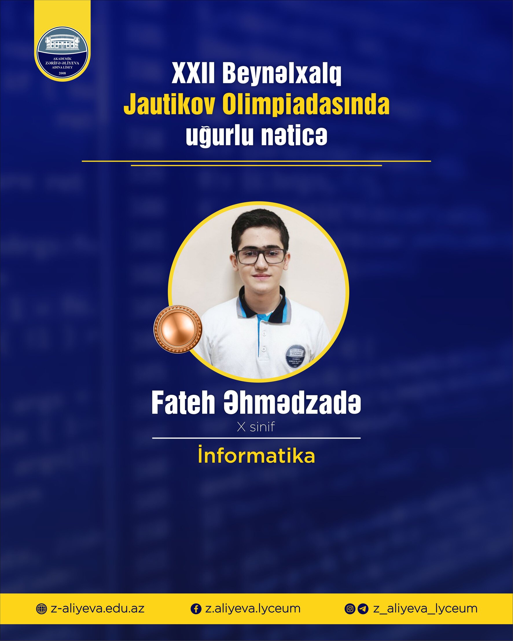 İnformatika fənni üzrə Akademik Zərifə Əliyeva adına liseyin X sinif şagirdi Fateh Əhmədzadə bürünc medala layiq görülüb.