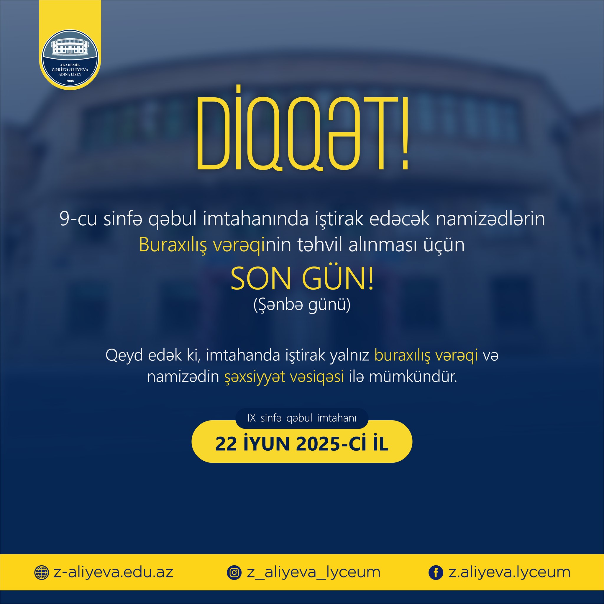 22 iyun 2025-ci il Azərbaycan Respublikasının Elm və Təhsil Nazirliyi tərəfindən IX sinfə qəbul üçün təşkil ediləcək qəbul imtahanı üçün buraxılış vərəqinin təhvil alınması üçün 21 iyun 2025-ci il son gündür. Buraxılış vərəqlərini təhvil almayan namizədlərin valideynləri 21 iyun (şənbə) tarixində (15:00-a qədər) liseyə yaxınlaşaraq imtahana buraxılış vərəqlərini təhvil ala bilərlər. Qeyd edək ki, imtahana giriş yalnız lisey tərəfindən təqdim edilən buraxılış vərəqi və şəxsiyyət vəsiqəsini birlikdə təqdim etdikdə mümkündür.