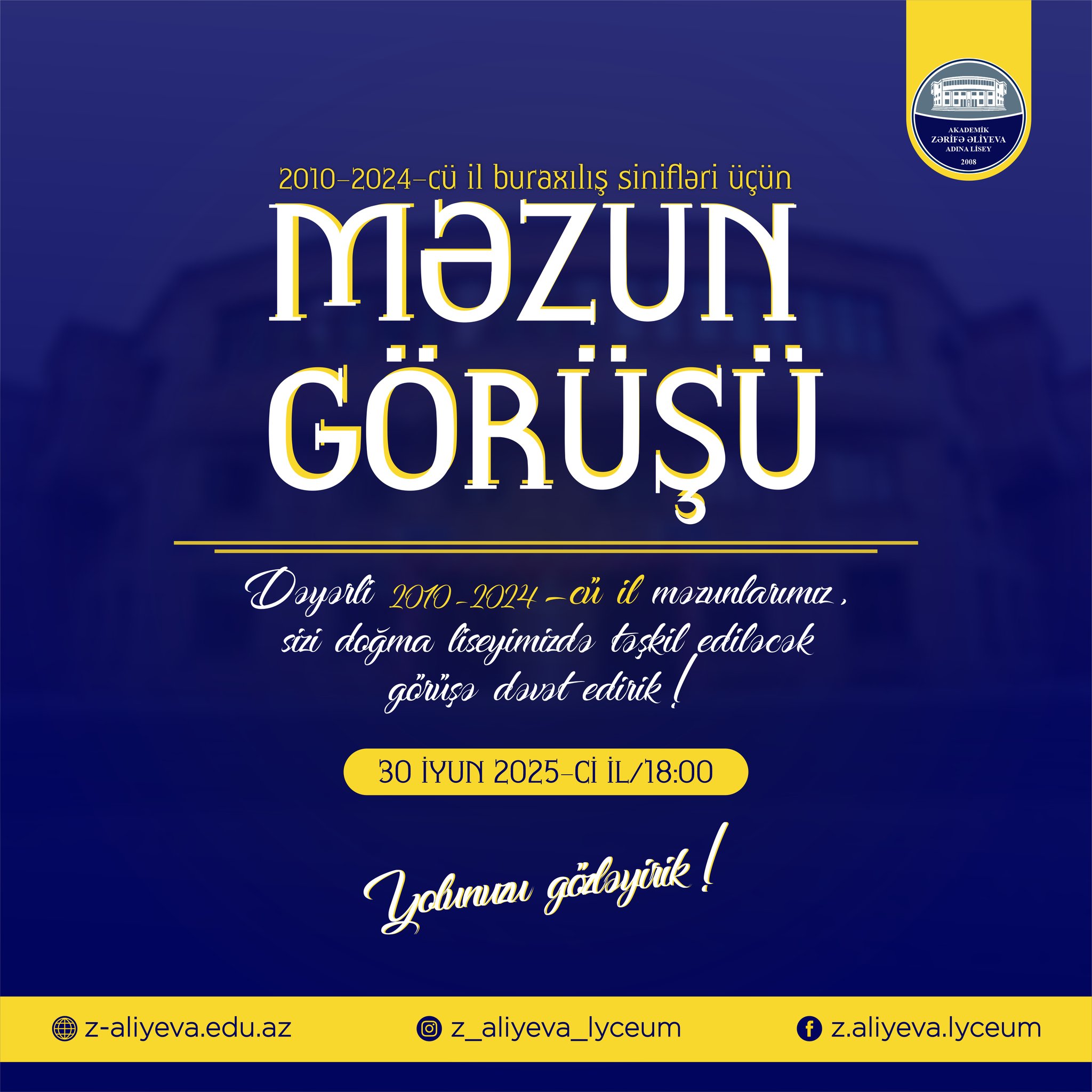 İyun ayının sonunda akademik Zərifə Əliyeva adına liseyin 2010-cu ildən 2024-cü ilə qədər olan məzunları üçün görüş təşkil edilir. Görüş 30 iyun 2025-ci il saat 18:00-da akademik Zərifə Əliyeva adına liseyin həyətində baş tutacaq. Görüşə yolu liseydən keçən bütün əməkdaşlarımız, ölkəmizdə və dünyanın müxtəlif ölkələrində, müxtəlif şirkətlərdə və ya qurumlarda fəaliyyət göstərən və eyni zamanda universitetlərdə tələbə olan məzunlarımız dəvətlidir.