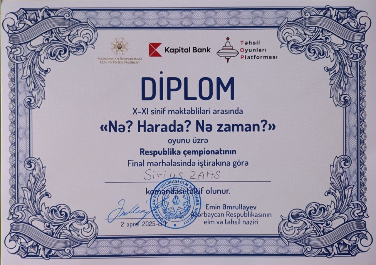 Çempionatda liseyimizin "SIRIUS ZAHS" adlı komandası iştirak edərək yuxarı pillələrdə qərarlaşıblar.