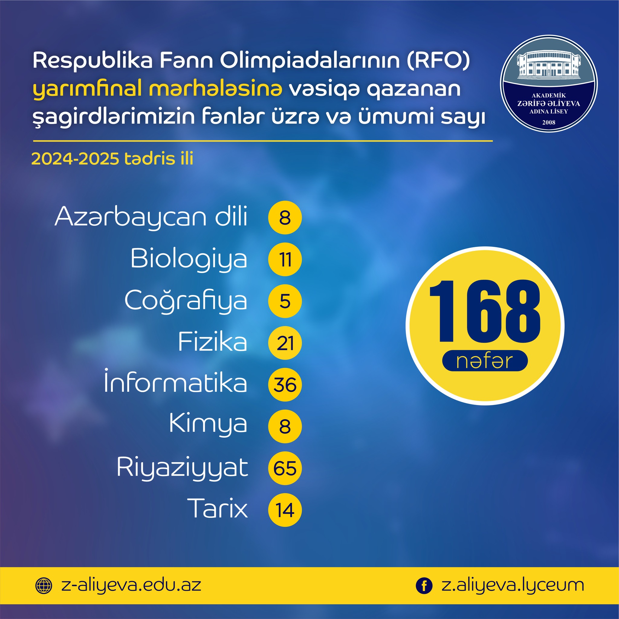 Respublika Fənn Olimpiadalarının birinci mərhələsinin nəticələrinə əsasən liseyimizin yarımfinal mərhələsində iştirak hüququ əldə etmiş şagirdlərimizin siyahısı elan edilib. Onlardan 8-i Azərbaycan dili və Ədəbiyyatdan, 11-i Biologiyadan, 5-i Coğrafiyadan, 21-i Fizikadan, 36-ı İnformatikadan, 8-i Kimyadan, 65-i Riyaziyyatdan, və 14-ü Tarixdən olmaqla ümumilikdə 168 şagirdimiz növbəti mərhələyə buraxılmışdır.