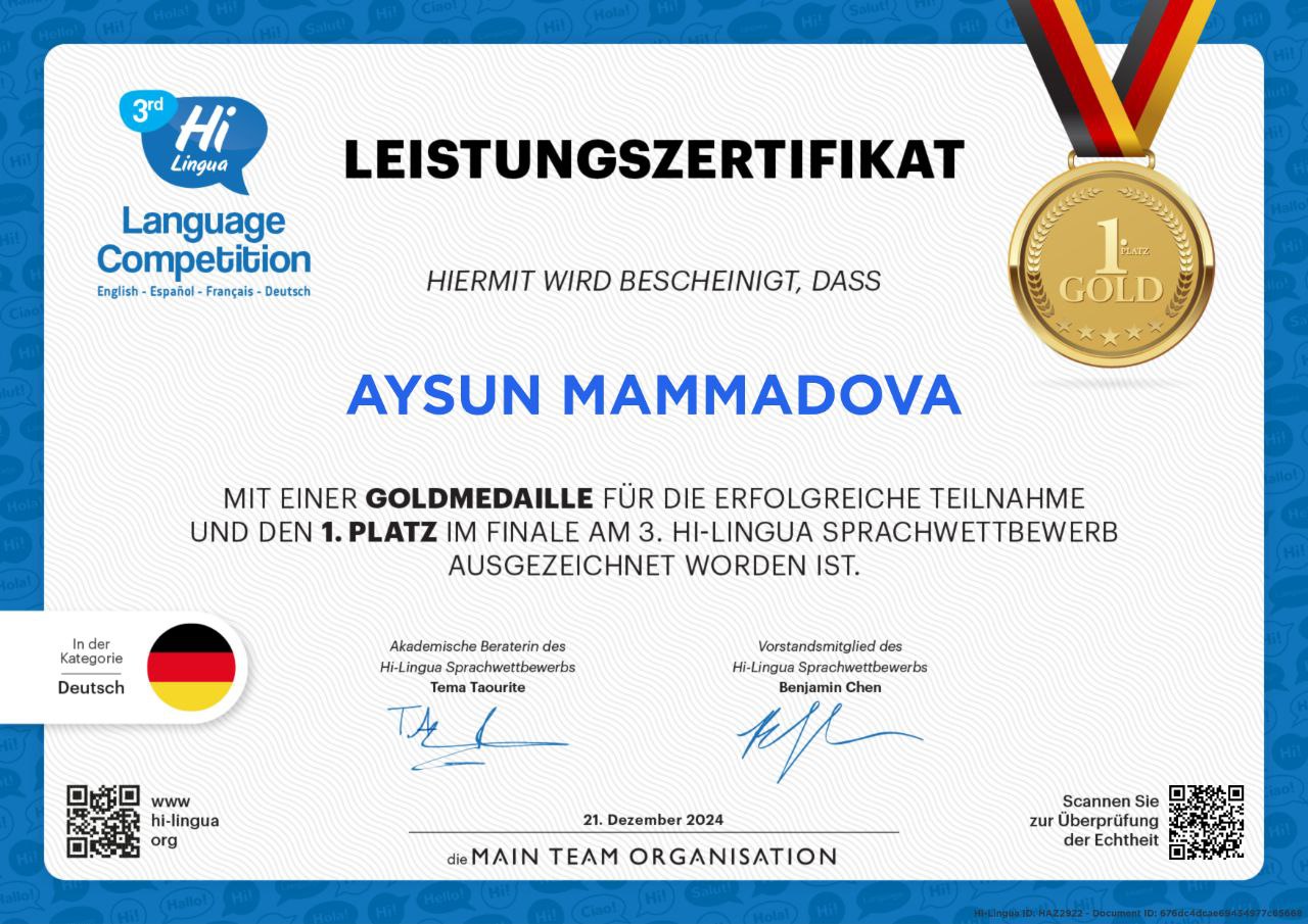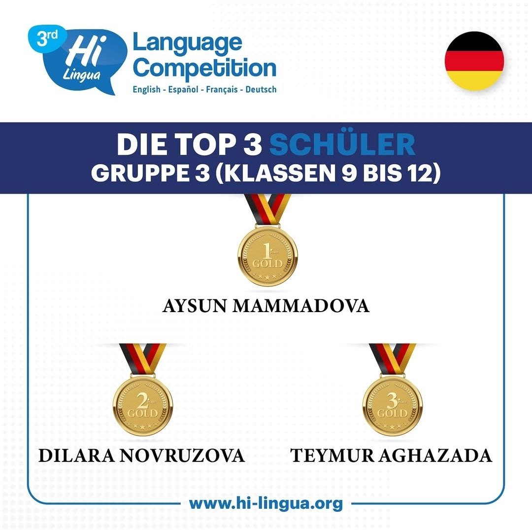 Liseyimizin X sinif şagirdi Aysun Məmmədova beynəlxalq "Hi-Lingua" dil olimpiadasında möhtəşəm nəticə əldə edib. İlkin olaraq Alman dili kateqoriyası üzrə nəzəri mərhələni uğurla keçərək final mərhələsinə yüksəlib. Müsahibə şəklində olan final mərhələsində isə ən yüksək nəticə əldə edərək I yerə layiq görülüb və Fransada təşkil ediləcək qrand mərhələdə iştirak hüququnu 75% endirimlə əldə edib.