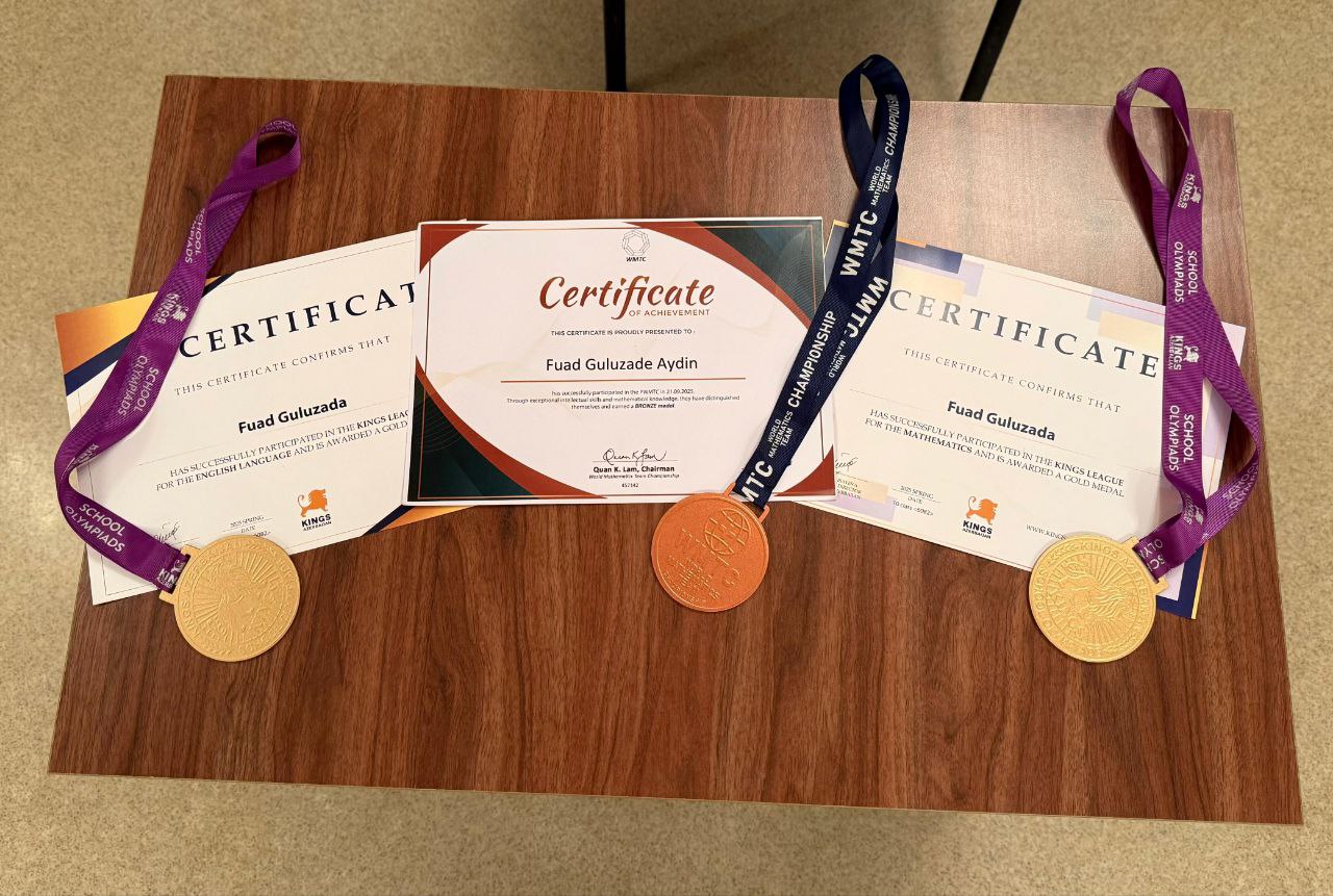Liseyimizin 11r2 sinif şagirdi Fuad Quluzadə "Kings" beynəlxalq məktəb olimpiadasında Riyaziyyat və İngilis dili fənləri üzrə qızıl medala, "WMTC" dünya riyaziyyat çempionatı üzrə isə bürünc medala layiq görülmüşdür. Şagirdimizi ürəkdən təbrik edir, gələcək işlərində uğurlar arzulayırıq.